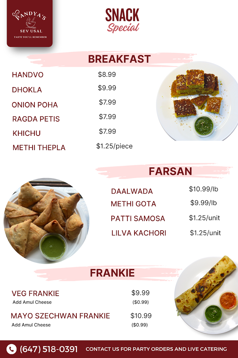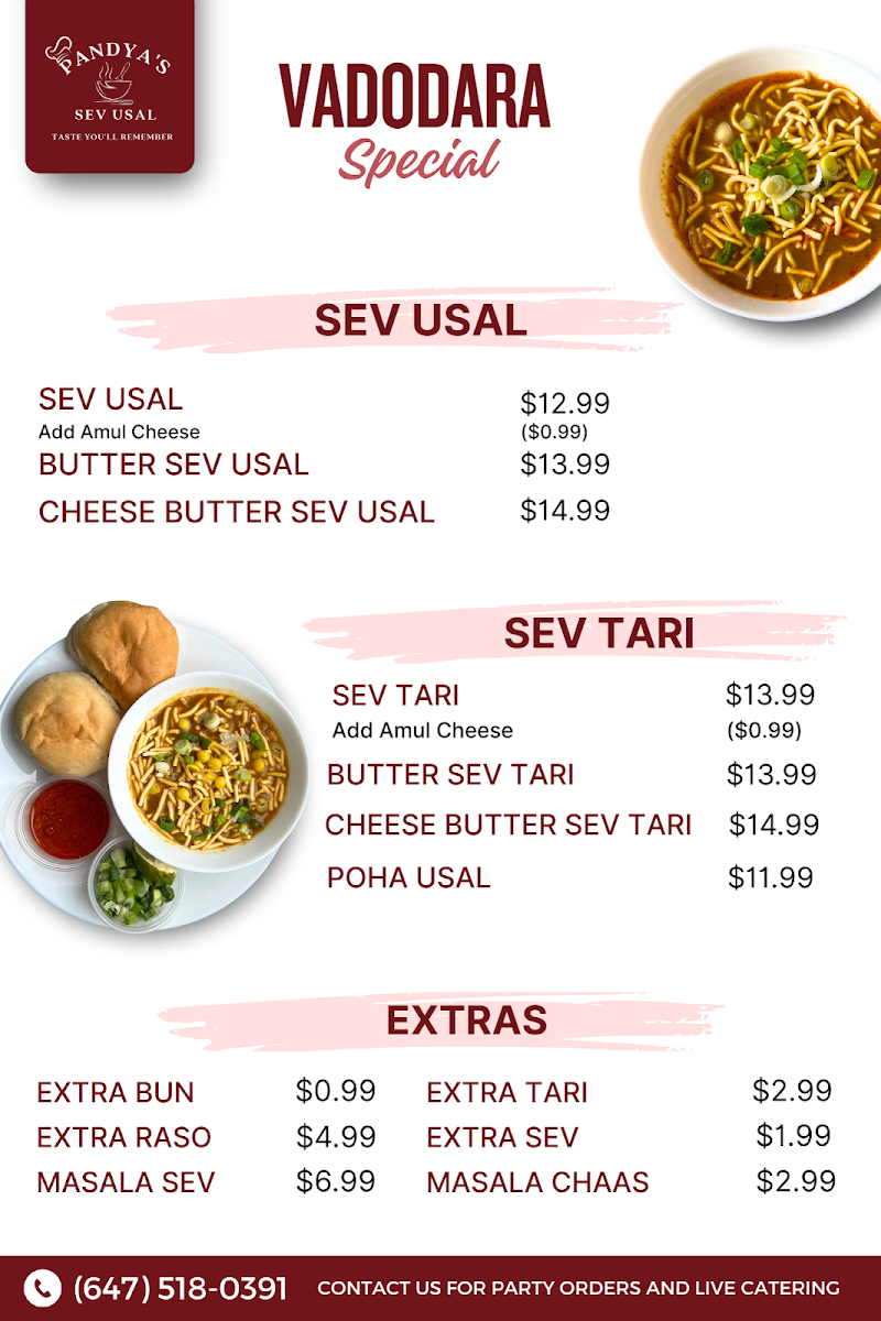 Welcome to Pandya's Sev Usal/Svaad Foods, where the aroma of authentic Indian cuisine fills the air! Nestled in Mississauga, this gem specializes in street-style delights, most notably their exquisite Sev Usal. Customers rave about the rich, flavorful curry perfectly balanced with spices, complemented by the crispy sev and fresh toppings.